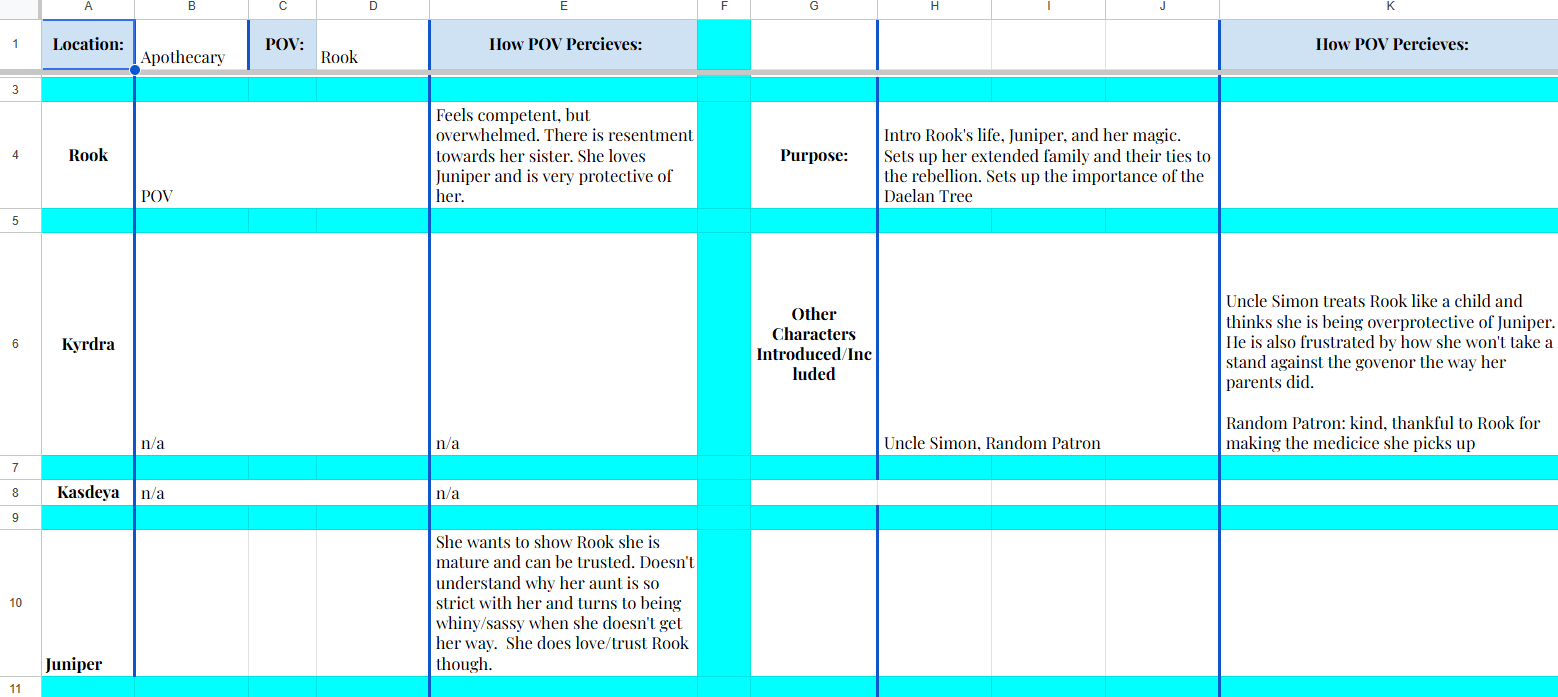 But this is where I examine how the characters feel about one another. So since only Rook and Juniper are in this chapter, they are the only boxes I have filled in. Rook is my POV character, so I just have a brief look at how she perceives her current situation and how she perceives any of the other main characters. Then for Juniper, it’s how she perceives Rook. This is only the second chapter of the book, so there isn’t as much to fill out, but as the rest of the characters meet each other and begin to interact, this will have a lot more filled out.